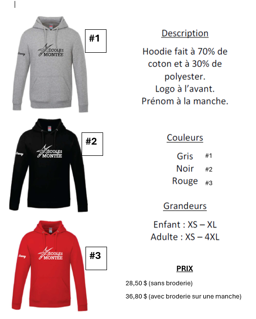 Nous vous offrons la possibilité de vous procurer un hoodie de l'école de la Montée. L'école ne fait aucun profit sur cette vente. Le prix affiché est celui qui nous sera facturé.